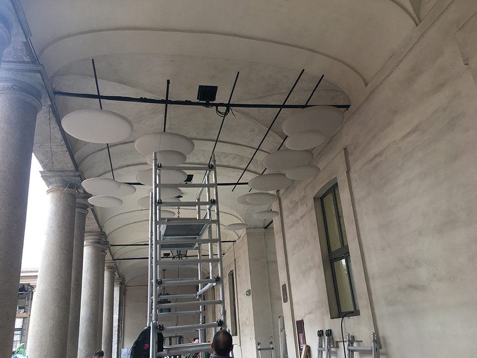 Eterno Ivica, with their own signature soundproof panels from the Phonolook line , completed the bar area in the courtyard of Palazzo Litta, and thanks to the Pedestal line with SE supports, the "Tempietto nel bosco" by Asif khan could aim high.