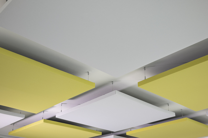 Questo progetto è un esempio di versatilità che la gamma Phonolook può offrire in quanto a modalità di posa in opera. Nella prima sala si è deciso di aumentare la superficie di fonoassorbimento su entrambi i lati installando i 9 pannelli in sospensione al soffitto attraverso l’apposito kit in acciaio plastificato. Il tessuto è stato scelto nelle varianti di colore verde acido e grigio tenue con l’intento di dare luce all’ambiente e creare l’abbinamento perfetto con l’arredo già presente quali sedie e scrivanie.