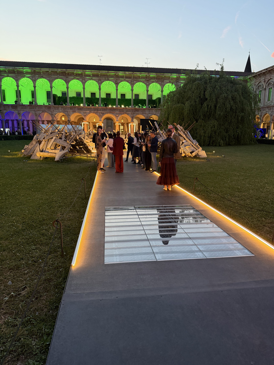 As technical sponsor of MATERIAE, the exhibition by Interni Magazine in the Courtyard of Honour of the University of Milan, we contributed to a highly symbolic installation. MATER transforms construction debris into relational space, forming a sixteen-meter-diameter ring that is both ruin and architecture, boundary and shelter. Inspired by reconstruction themes, the project reflects on matter as memory and possibility. At its center, the exhibition platform showcases our technology, made visible through a LED-backlit glass section revealing the engineering core: PRIME® NEW MAXI adjustable supports, GRID PLUS, and cross spacers.